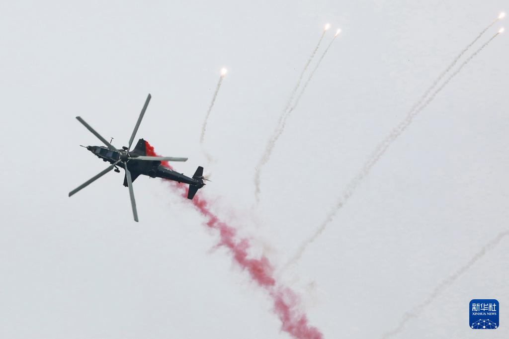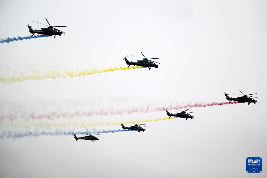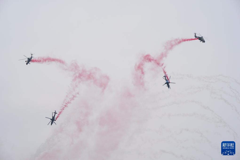 10月16日,在第七届中国天津国际直升机博览会开幕式上,陆军“风雷”飞行表演队进行飞行表演。新华社记者 李然 摄