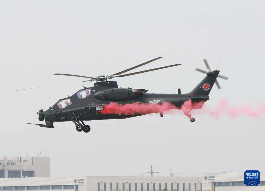 10月16日,在第七届中国天津国际直升机博览会开幕式上,陆军“风雷”飞行表演队进行飞行表演。新华社发(栾铖摄)