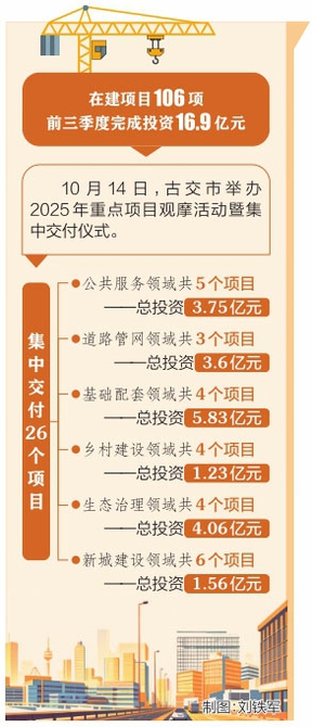 本报讯(记者李志江)10月14日,古交市举办2025年重点项目观摩活动暨集中交付仪式,总投资20亿余元的26个重点项目此次集中交付使用,涵盖公共服务、道路管网、基础配套、乡村建设、生态治理和新城建设六大领域。为该市提升城市综合服务功能、推动高质量发展注入了强劲动能。
