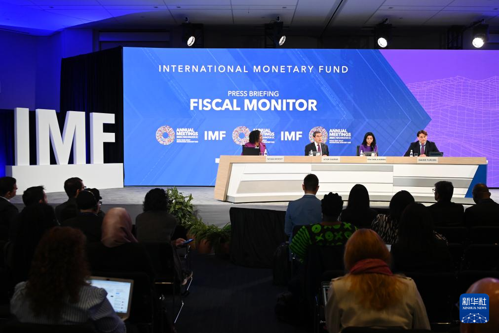 这是10月15日在美国华盛顿拍摄的国际货币基金组织《财政监测报告》新闻发布会现场。