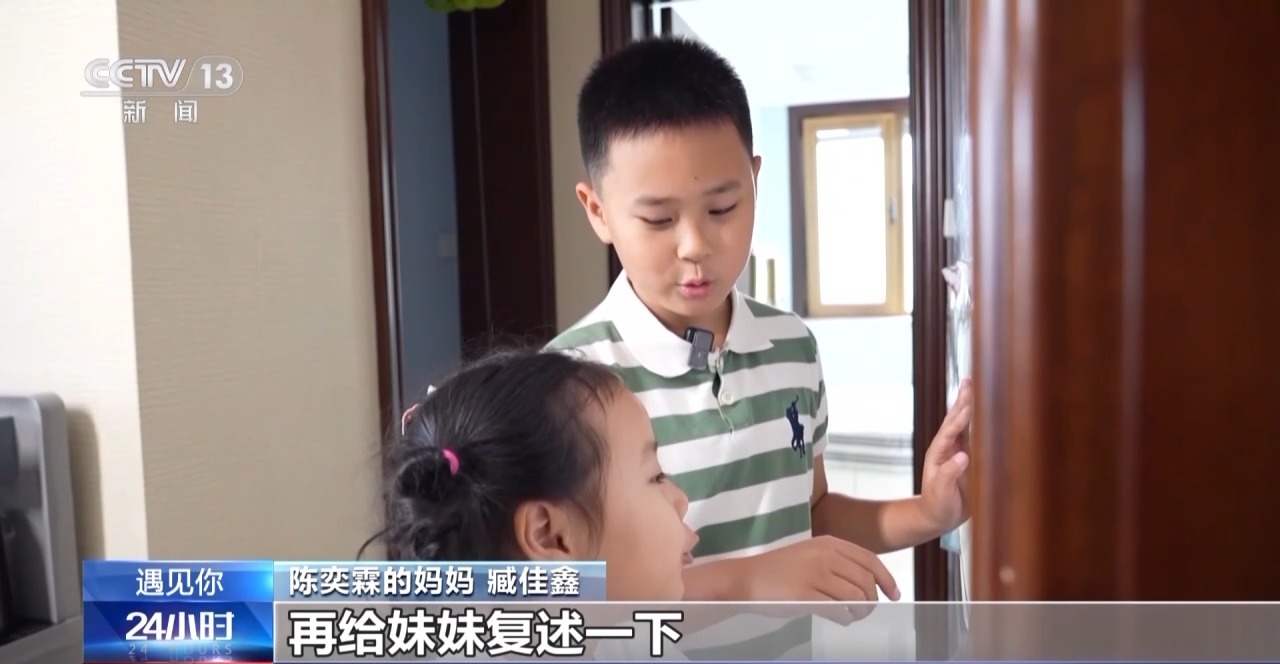 陈奕霖的妈妈 臧佳鑫:他就跟我说,妈妈你知道吗,呼叫铃不是按下就接通,而是要长摁3秒。我说这个又是你教给妈妈的一项新的人生技能,等他和妹妹见面之后,我们就引导他把这件事情再给妹妹复述一下。他说妹妹你要记着,这个呼叫铃不可以随便摁,如果你真的被困到电梯里,要长摁三秒才可以接通。
