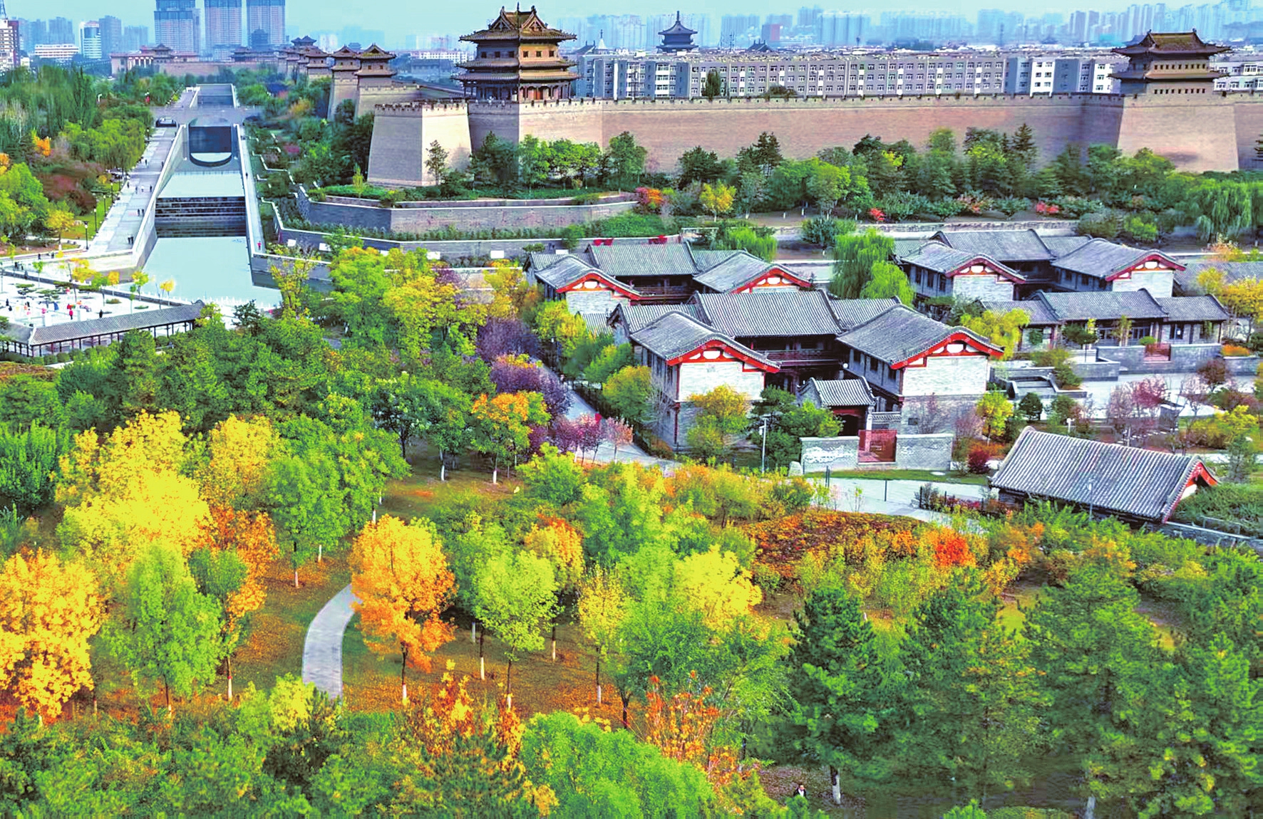 时下,大同城墙带状公园迎来最佳赏秋季。红的海棠、黄的国槐、绿的松柏交织辉映。护城河波光粼粼,倒映着古城墙与湛蓝天空,成为热门打卡点。