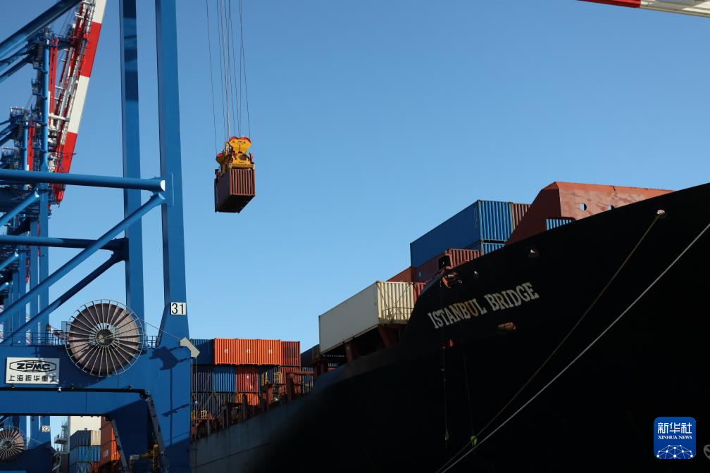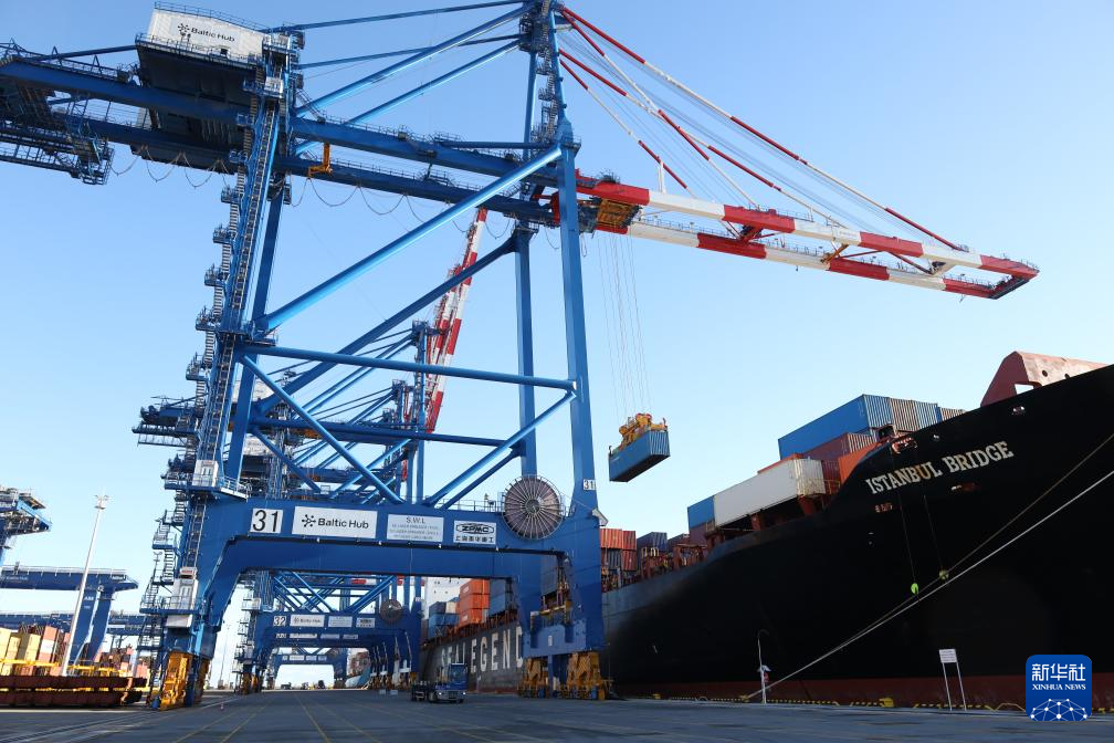 10月19日,在波兰北部格但斯克港,从中国宁波舟山港出发的中欧北极快航航线首艘货船进行装卸工作。