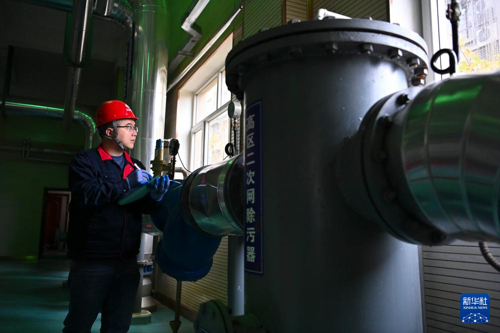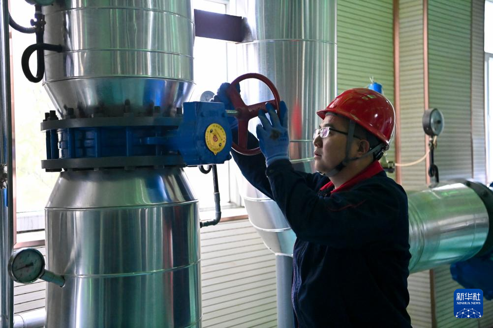 在太原市热力集团有限责任公司中继能源站,工作人员检查设备运行情况(10月19日摄)。