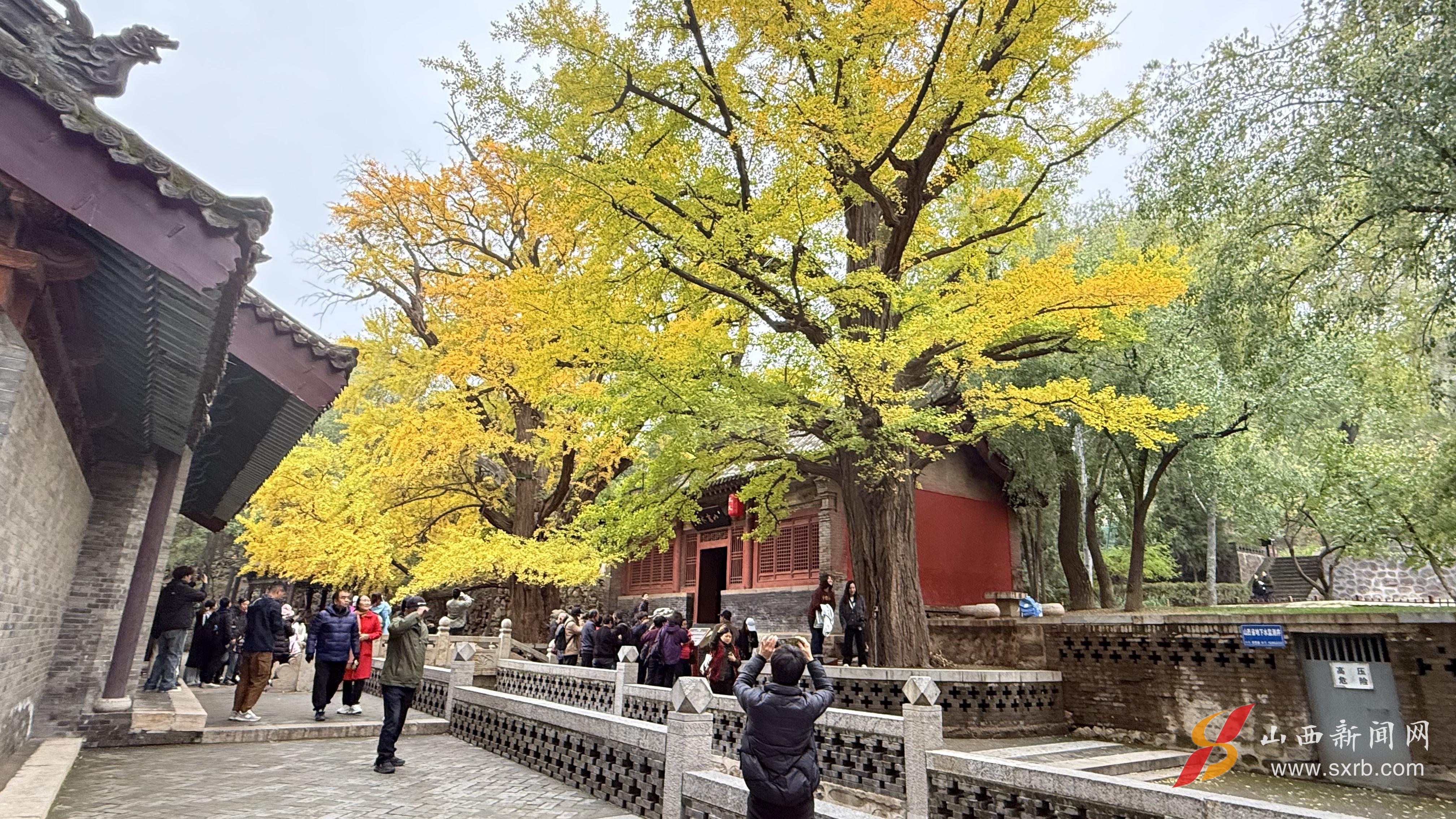 来自太原本地的摄影爱好者刘先生一边调整相机参数一边感慨:“我几乎每年都来,但每次看到这样的景象,依然会被震撼。这不只是看树,更像是与历史的对话。尤其在阳光下,金叶与古殿相映,那种美,镜头都不足以完全表达。”
