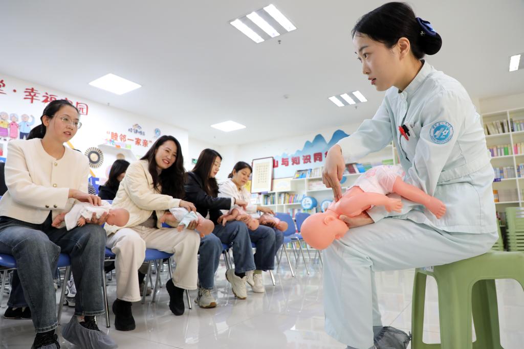 医护人员为居民讲解婴儿健康保障知识。新华社发(陈彬摄)