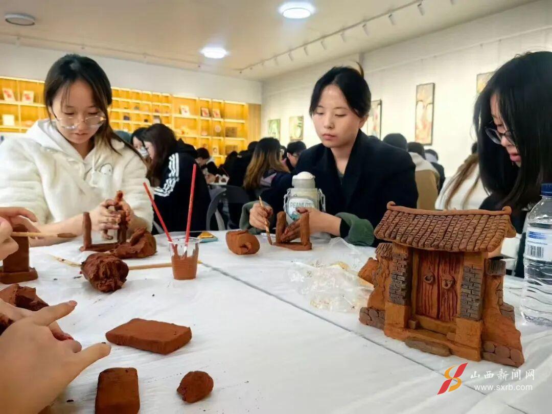 在非遗美学馆,贾银永现场演示“老院门”泥塑的制作过程。从揉泥、塑形到纹理雕刻,同学们跟随指导,将粗糙的陶土渐渐捏出形态。泥土在指尖翻转、成型,拙朴中透出灵性,传统技艺也在这一刻“活”了过来。