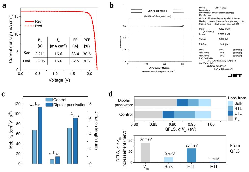 太赫兹辐射探测诊断结果清晰揭示了偶极钝化策略在促进电荷传输、抑制损耗等方面的微观机制。实验数据显示,经钝化处理的钙钛矿薄膜,总载流子迁移率提升68%以上,载流子扩散长度延长近30%。