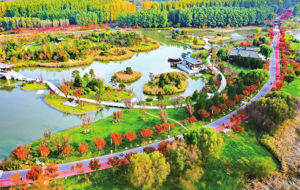 10月26日,长治漳泽湖国家城市湿地公园,五彩斑斓的秋景如诗如画,吸引市民和游客前来观赏打卡,享受秋日美好时光。