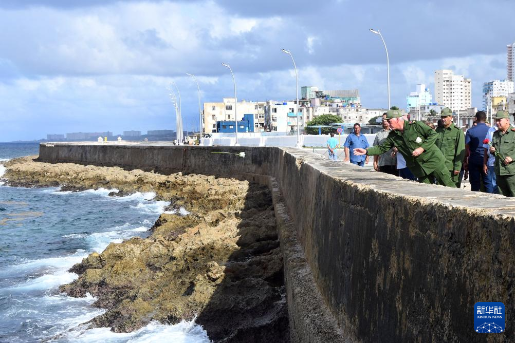10月28日,在古巴首都哈瓦那海滨大道,古巴国家主席迪亚斯-卡内尔(中)向向海中抛撒鲜花,纪念古巴革命英雄卡米洛·西恩富戈斯遇难66周年。