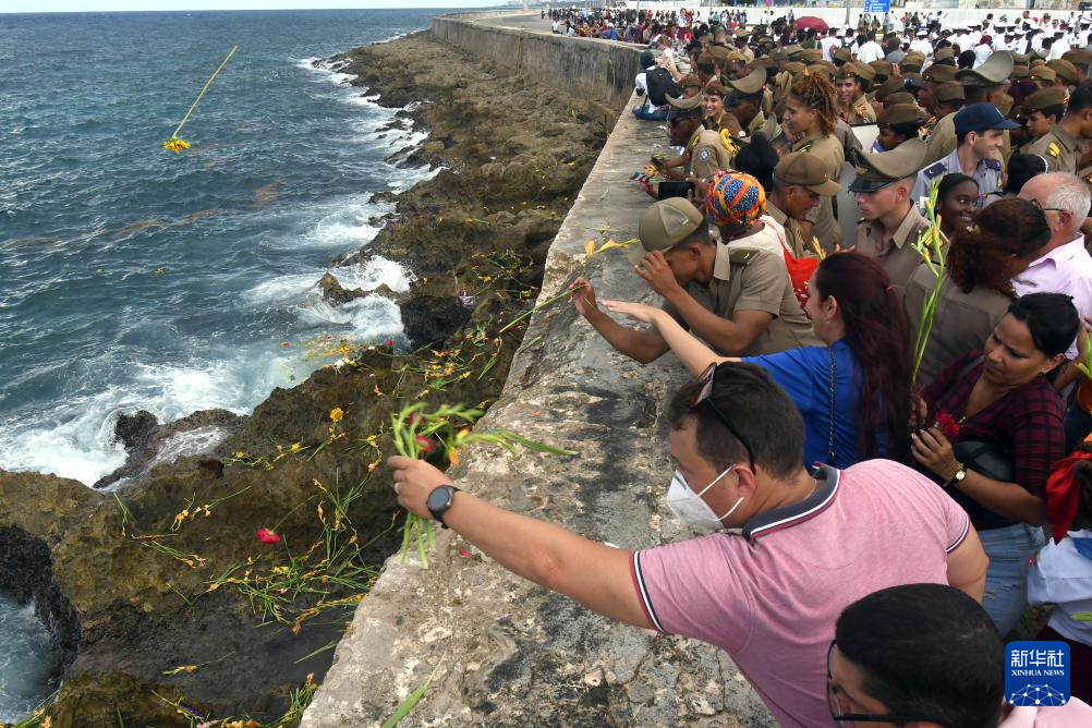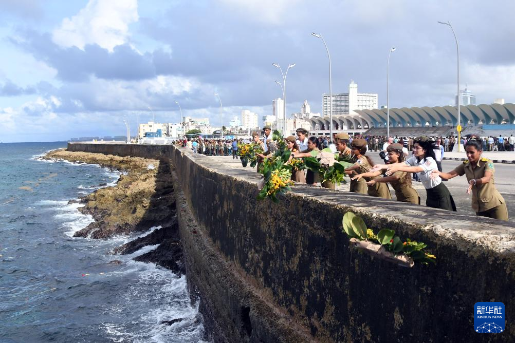 10月28日,在古巴首都哈瓦那海滨大道,古巴军事院校学员向海中抛撒鲜花,纪念古巴革命英雄卡米洛·西恩富戈斯遇难66周年。