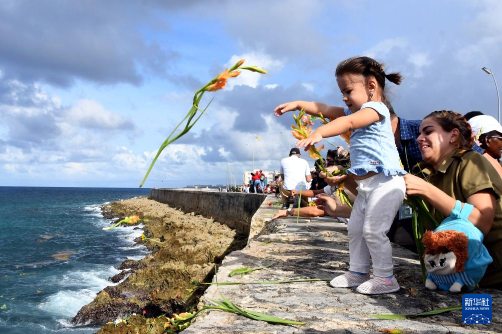 10月28日,在古巴首都哈瓦那海滨大道,一名小女孩在家人的陪伴下向海中抛撒鲜花,纪念古巴革命英雄卡米洛·西恩富戈斯遇难66周年。