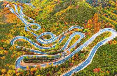10月17日拍摄的左权县太行龙泉风景区景色。太行一号旅游公路北天池段,似长龙盘旋在五彩斑斓的太行秋色之中,峰回路转,风景秀丽,绘成一幅绝美的天然画卷,带领游客开启诗意之旅。