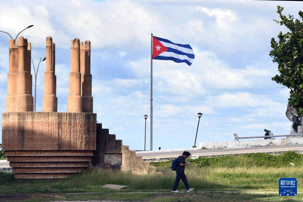 10月29日,行人从古巴首都哈瓦那街头飘扬的国旗旁走过。
