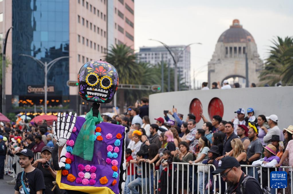 11月1日,在墨西哥首都墨西哥城,演员举着亡灵节装置参加游行。