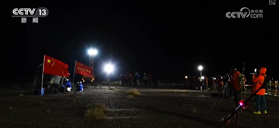 北京中心通报返回舱落点坐标后,搜救回收空中分队5架直升机迅速起飞升空,奔赴落点空域,精准降落在返回舱周围后,立即按程序进行相关处置。