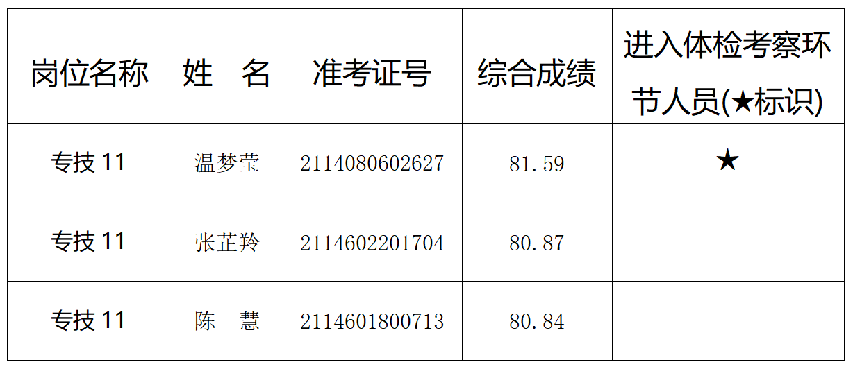 根据综合成绩(综合成绩=笔试成绩×60%+面试成绩×40%)从高分到低分的顺序,按岗位拟招聘人数1:1的比例确定体检考察人选(体检考察人员名单见附件)。
