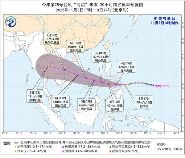 今年第25号台风“海鸥”仍在发展中,今天夜间到明天凌晨登陆菲律宾中部沿海(台风级或强台风级,40—45米/秒,13—14级),以后穿过菲律宾中部,将于5日早晨移入南海东南部海面,强度将继续加强,最强可达强台风级(45—50米/秒,14—15级),6日夜间逐渐趋向于越南中部沿海。