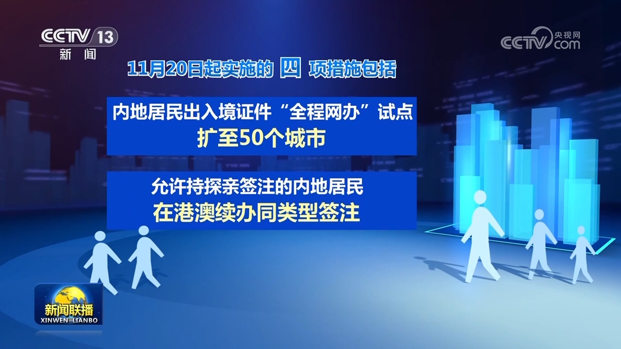 11月20日起开始实施的4项措施包括:内地居民出入境证件“全程网办”试点扩至50个城市;允许持探亲签注的内地居民在港澳续办同类型签注;可签发一次有效台胞证的口岸由58个增至100个;外国人入境卡可通过多种线上渠道提前填报。