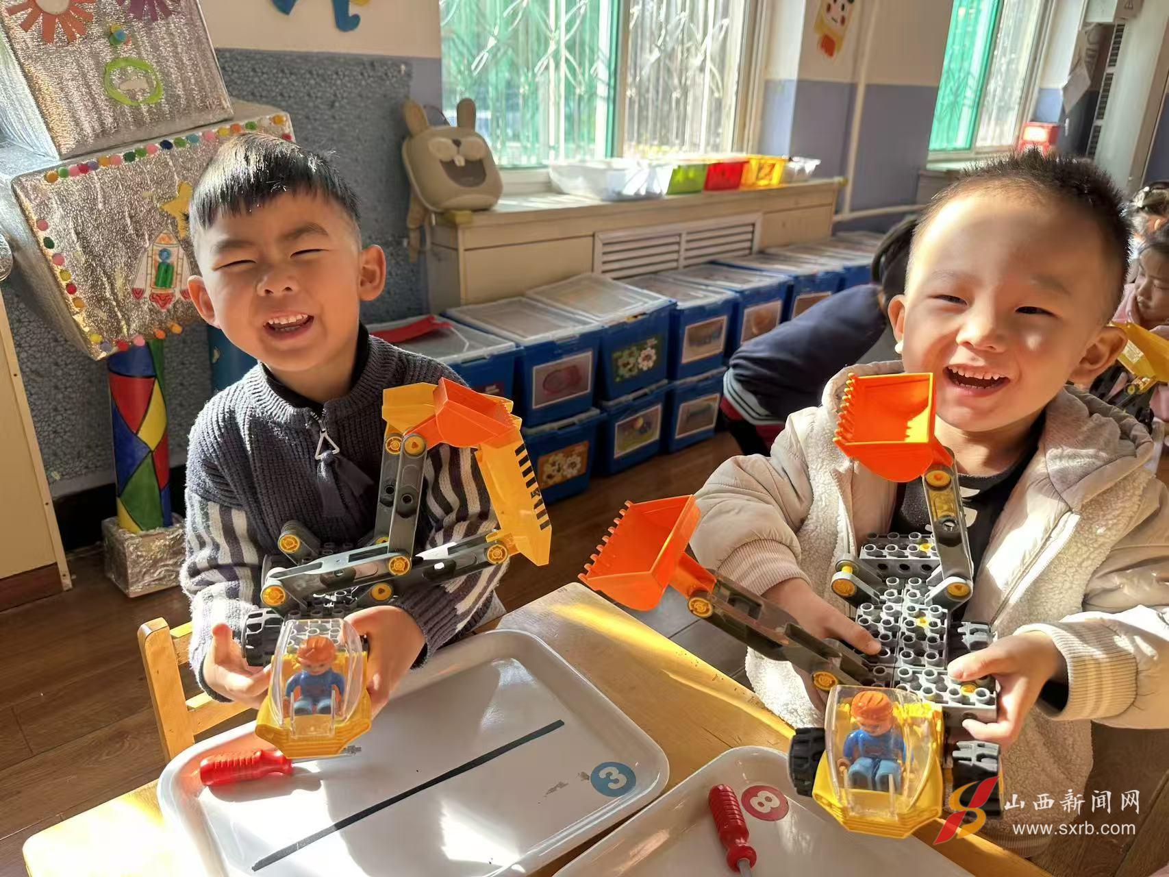 蓝色车厢对应可回收物,绿色区域收纳厨余垃圾……孩子们在拼搭中潜移默化地熟悉了分类规则。遇到难题时,他们或小声讨论,或举手求助,现场洋溢着探索与合作的暖意。
