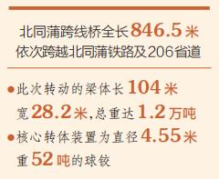 北同蒲跨线桥全长846.5米,依次跨越北同蒲铁路及206省道。此次转动的梁体长104米、宽28.2米,总重达1.2万吨。由于转体系统设置于铁路营业线范围内,施工技术复杂,安全管控要求极高。