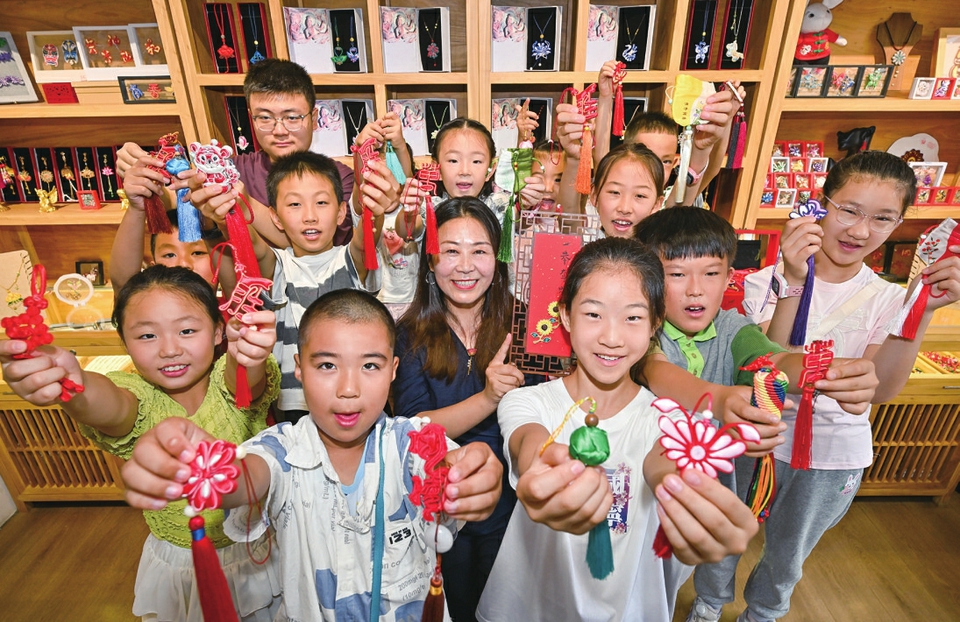学生在研学活动中展示手工结艺作品。