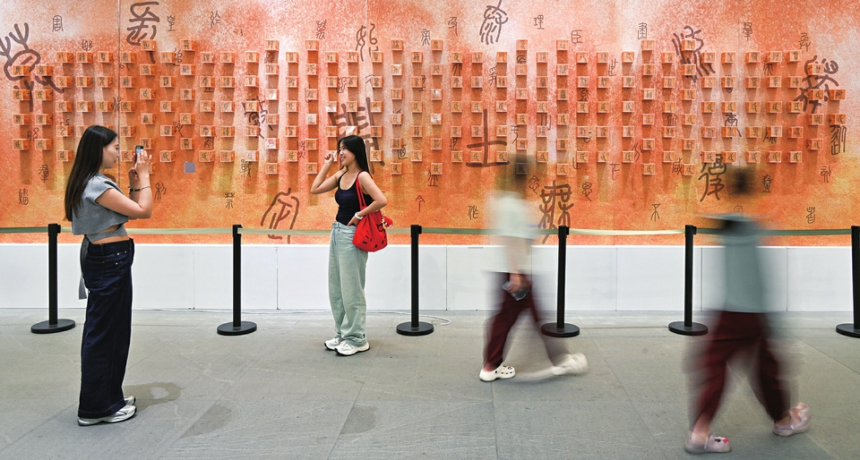 游客在大同市美术馆非遗展厅的结艺作品《北魏姓氏融合》前拍照留念。