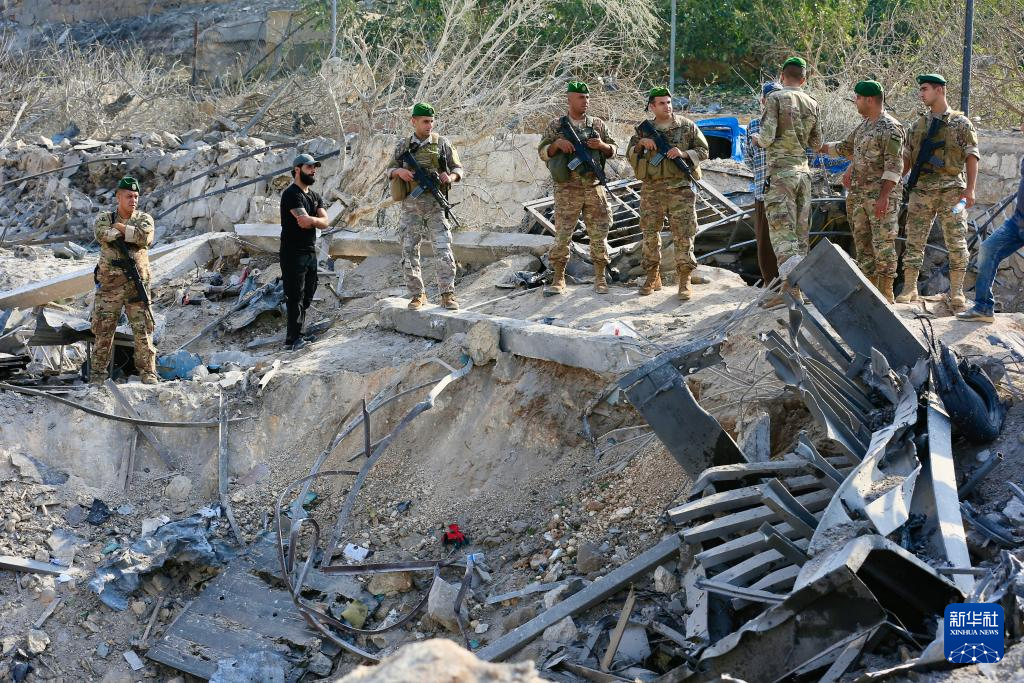 11月6日,在黎巴嫩南部城市提尔的阿巴西耶镇,黎巴嫩民众和军人查看以色列空袭现场。