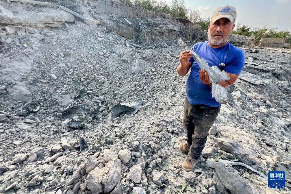 11月6日,在黎巴嫩南部城市提尔的阿巴西耶镇,一名黎巴嫩民众展示以色列空袭留下的弹片。