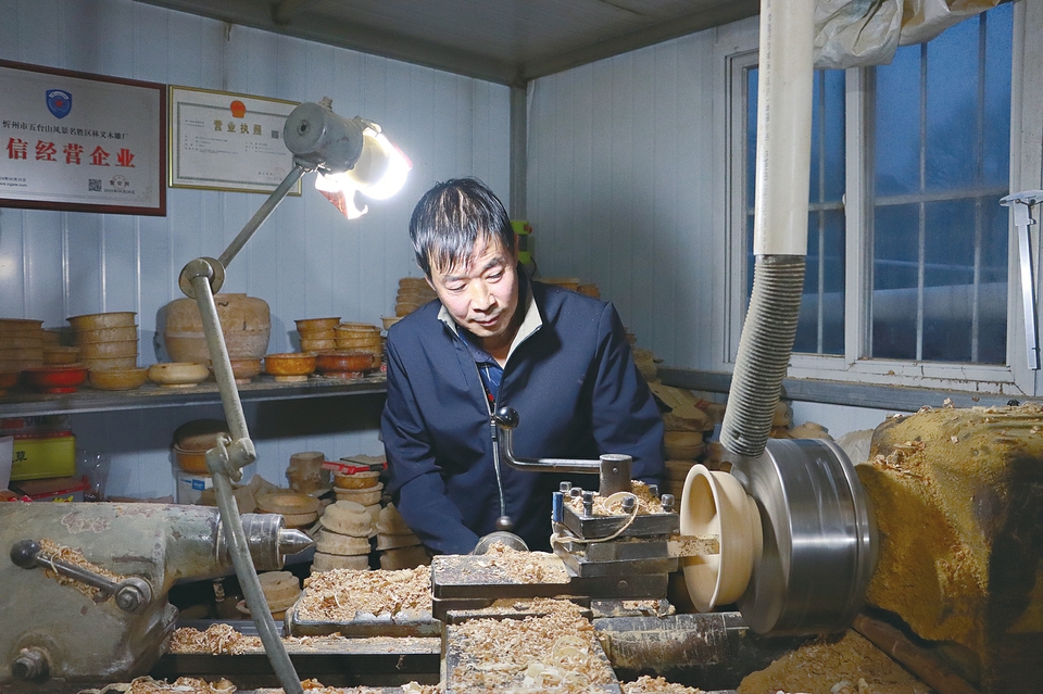 这几年,韩林义陆续开发出笔筒、笔架、茶具、酒具等生活化产品,让五台山木艺大放光彩,也带来了丰厚的经济回报。手工机床从当初1台增加到了现在的6台,既能精雕出寸许的小酒杯,也能细刻成尺余的木盆,既可大批量生产也可小众化定制。2022年,韩林义入选中华优秀传统文化人才库。