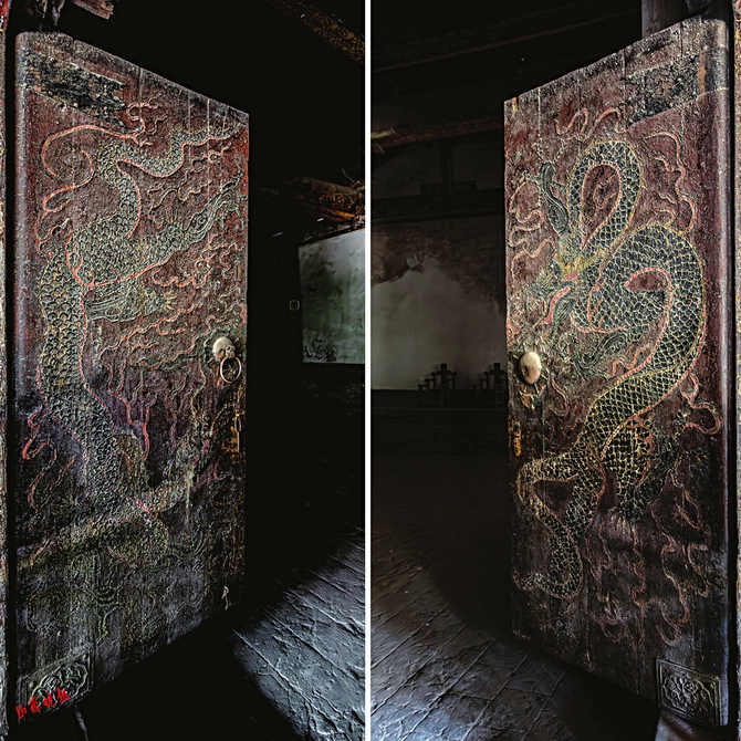 10.大殿板门为元代遗构,门上沥粉堆金的盘龙图案虽历经沧桑,依然可见当年风采。