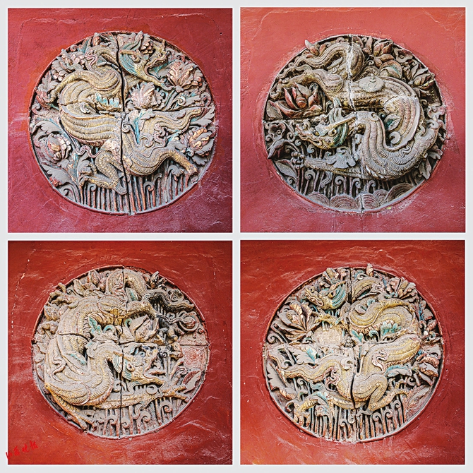 8.山门两侧内墙镶嵌元代琉璃团龙,雕工精细,虽有切割修补痕迹,但灵动依旧。