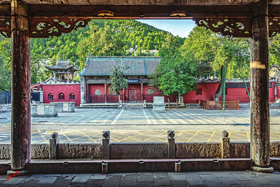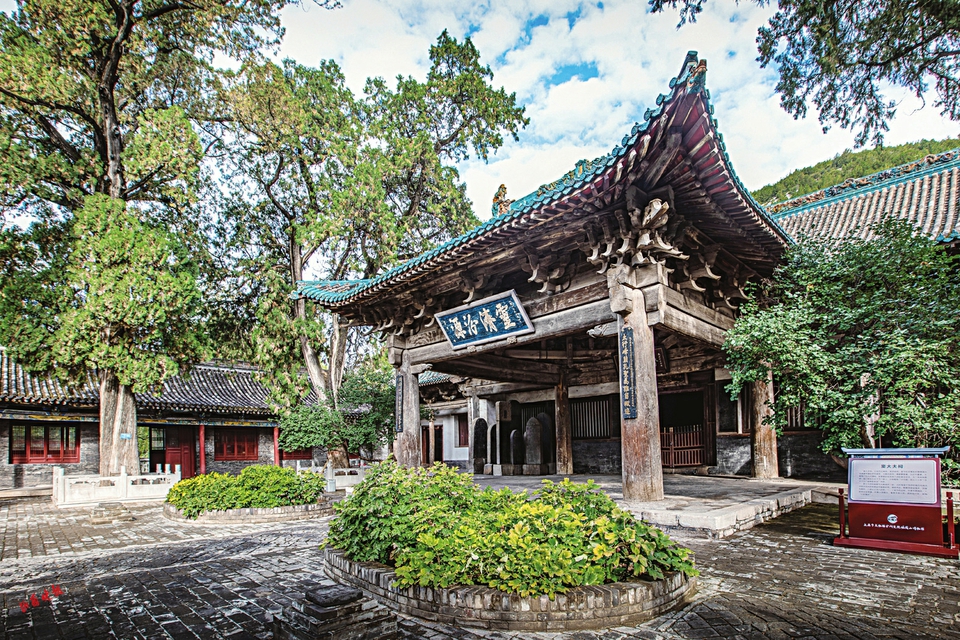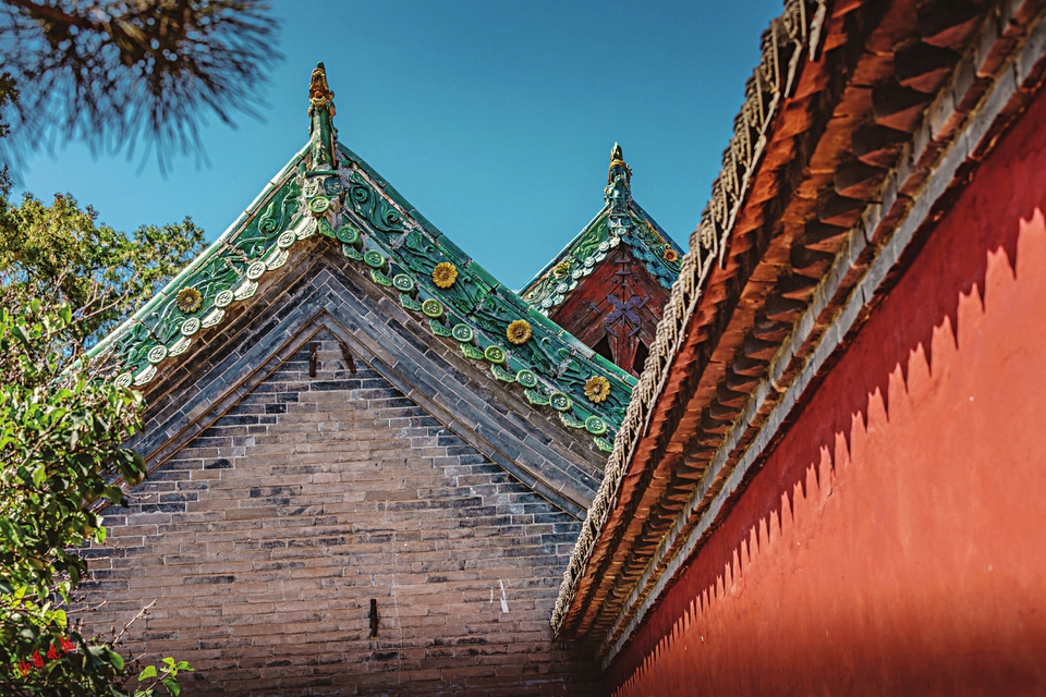 7.南殿(山门)面阔五间,为单檐悬山顶明代遗构,两侧内墙明三暗五结构,山门两侧镶元代琉璃团龙。
