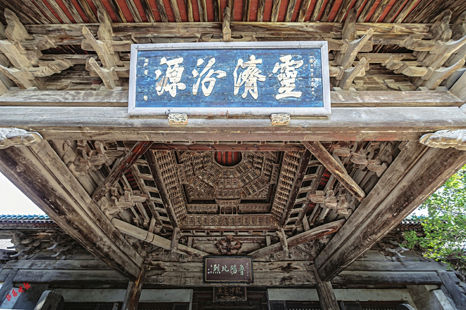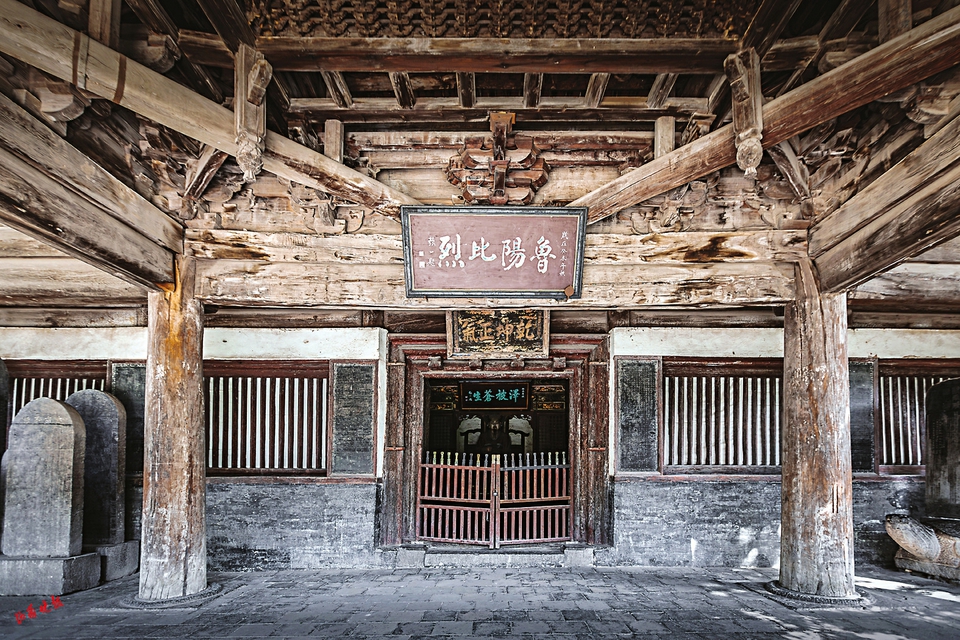 3.献殿“灵济汾源”匾额,意为窦犨以民生为本,兴修水利“济助”百姓,赋予汾河“灵济”之名,是对他功绩的赞颂。“鲁阳比烈”中的“鲁”指鲁国的孔子,“阳”为晋阳,代指窦犨,表达对窦犨品德和功绩的高度评价。
