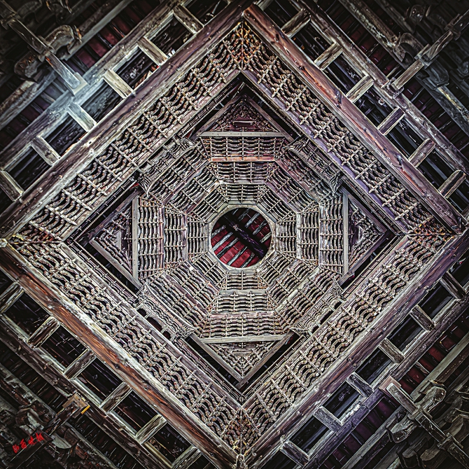 2.献殿天花藻井堪称奇观,由斗拱递叠而就,融天圆地方、楼阁烟火、易经八卦于一体,玲珑别致,疏朗奇巧。