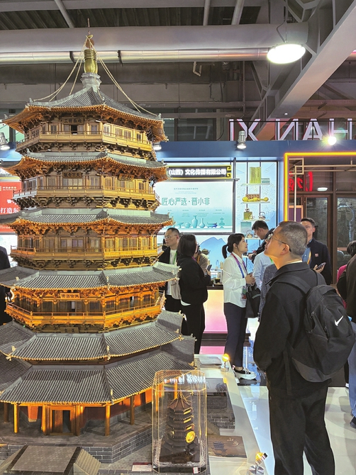 十一月七日,进博会山西展厅,一名观展客商驻足观看由山河营造文化发展(山西)有限公司带来的应县木塔复刻模型,探究榫卯结构的奥秘。