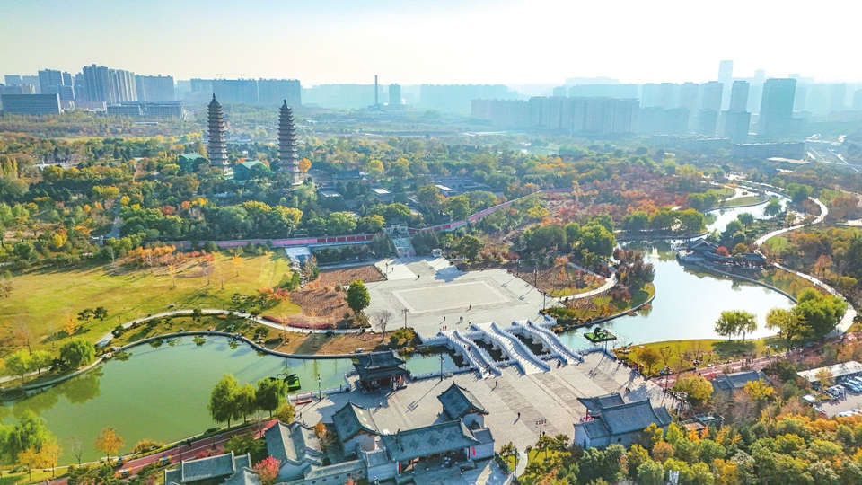 11月4日,太原市双塔公园,红墙古建,水系蜿蜒,古今风貌交融,尽显城市公园之雅韵。