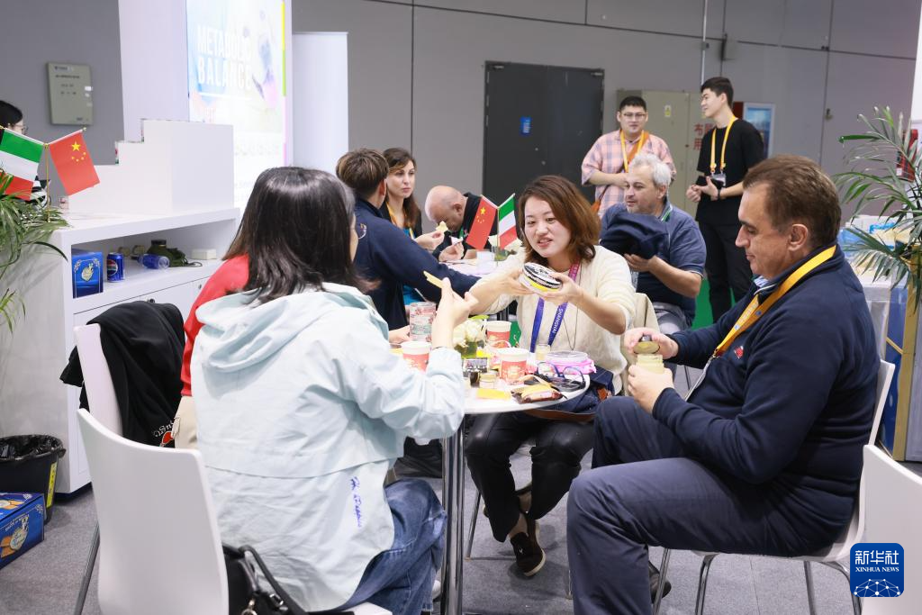 这是11月9日在第八届进博会农食产品展区拍摄的意大利食品与饲料出口促进会展台一角。