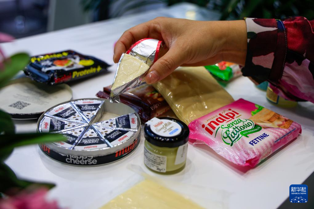 这是11月9日在第八届进博会农食产品展区拍摄的意大利伊纳尔皮集团(Inalpi)的产品。