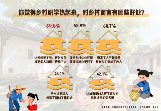 乡村研学“热”起来,也给乡村带来了许多生机。调查显示,69.8%的受访者认为乡村研学能让乡村传统手工艺、民俗文化被更多人知道并传承下去;63.9%的受访者认为能促使乡村优化环境,基础设施更好了;60.7%的受访者表示乡村研学给当地带来了人气和消费,帮老乡们增加了收入。其他还有:给当地年轻人创造了新的工作机会(46.1%)、让城市里的人更了解乡村,提升地方的知名度(42.1%)等。