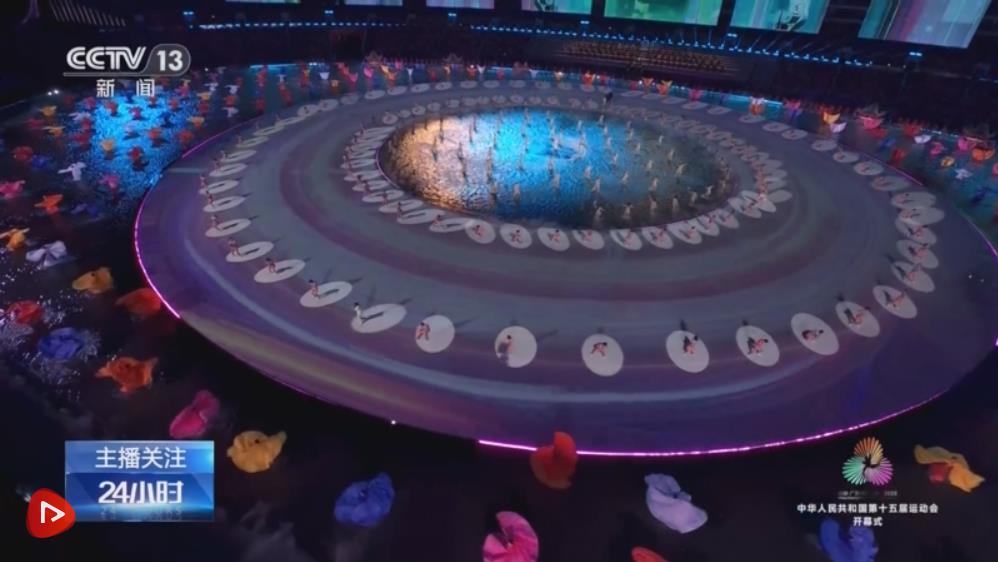第十五届全国运动会开幕式11月9日晚上在广东奥体中心举行。开幕式以“圆梦未来”为主题,充分体现粤港澳三地承办的特色,主创团队创新完成了“把大海搬到场馆”的舞美设想,首次将同心圆与水面舞台结合,凸显了湾区特色,也展现了粤港澳三地一海相连、同根同源。