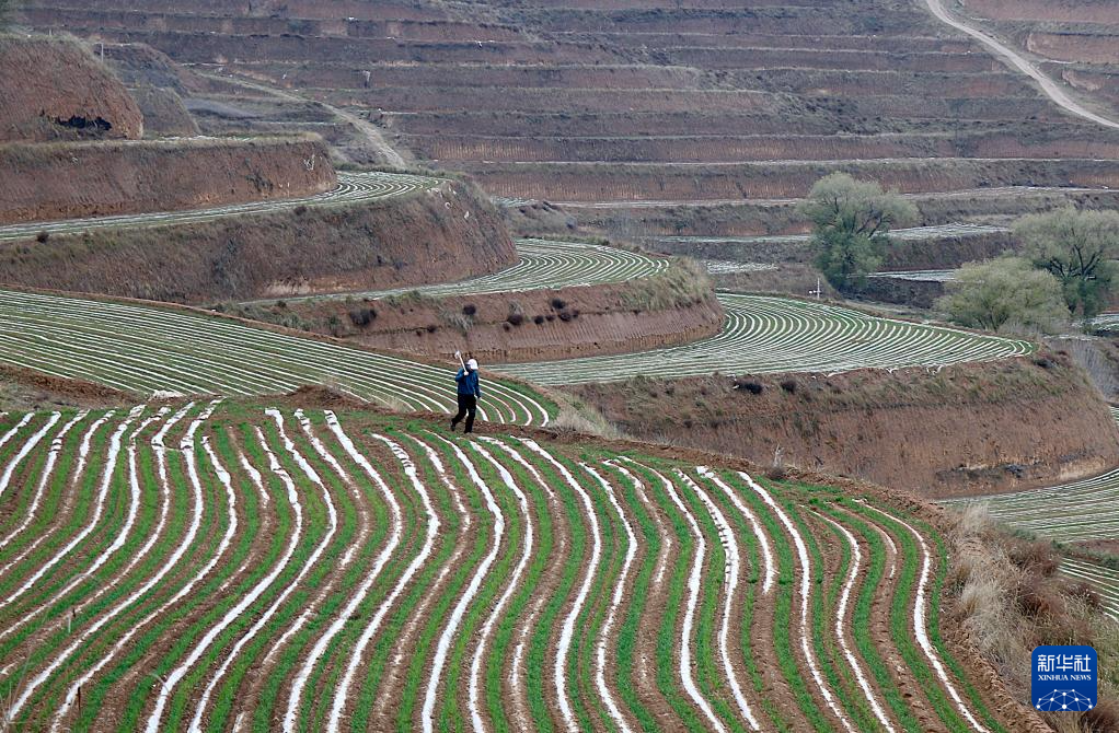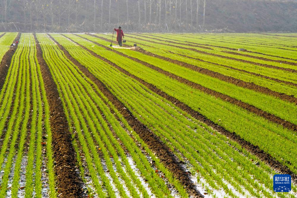 11月10日,在甘肃省平凉市静宁县三合乡前咀村,农民在覆膜后的冬小麦田里劳作。