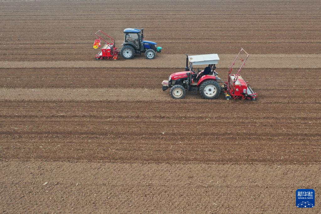 11月11日,河南省焦作市温县黄庄镇常庄村村民驾驶播种机在田间播种小麦(无人机照片)。