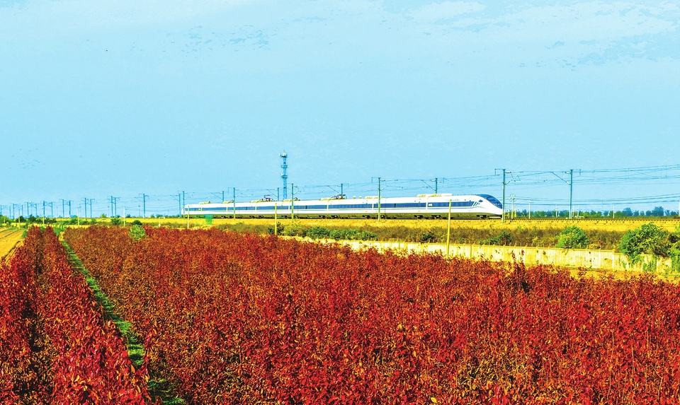 11月9日,永济市田野间,一列动车组疾驰在大西高铁线上,与湛蓝的天空、成片的红叶相映成景,宛如一幅诗意画卷铺展于大地。