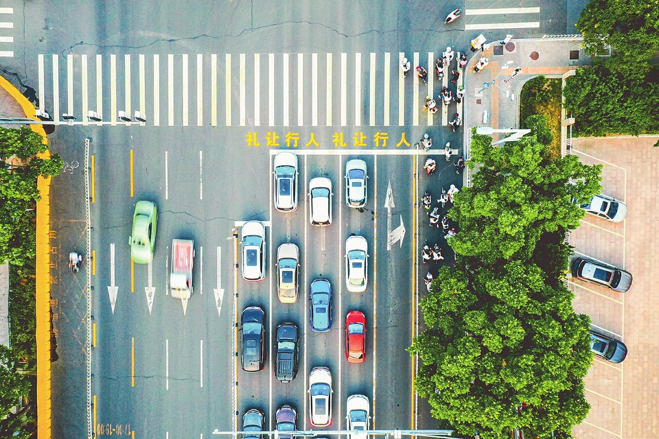 城市十字路口,交通秩序井然。