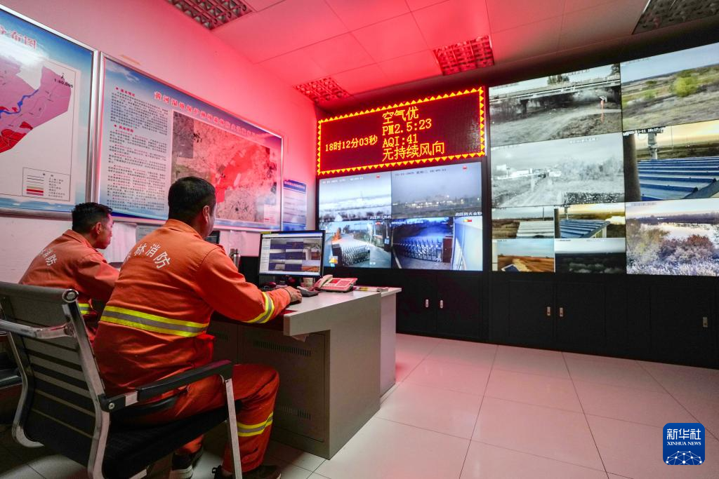 11月11日,工作人员在宁夏平罗天河湾国家湿地公园监控室内通过智能监测平台监测湿地情况。