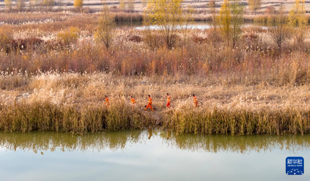11月11日,工作人员在宁夏平罗天河湾国家湿地公园内巡查(无人机照片)。