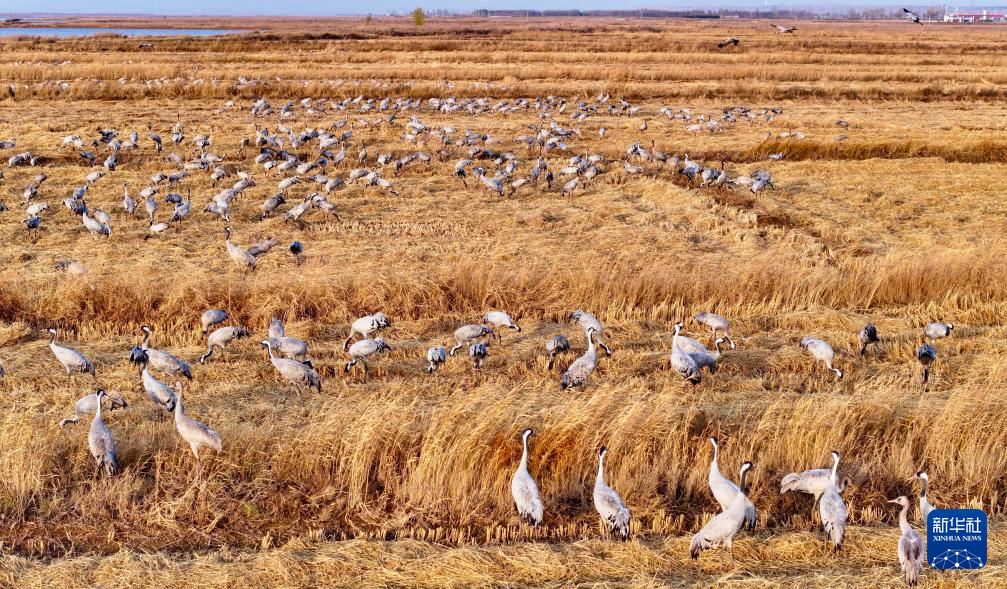 11月11日,候鸟在宁夏平罗天河湾国家湿地公园栖息觅食(无人机照片)。