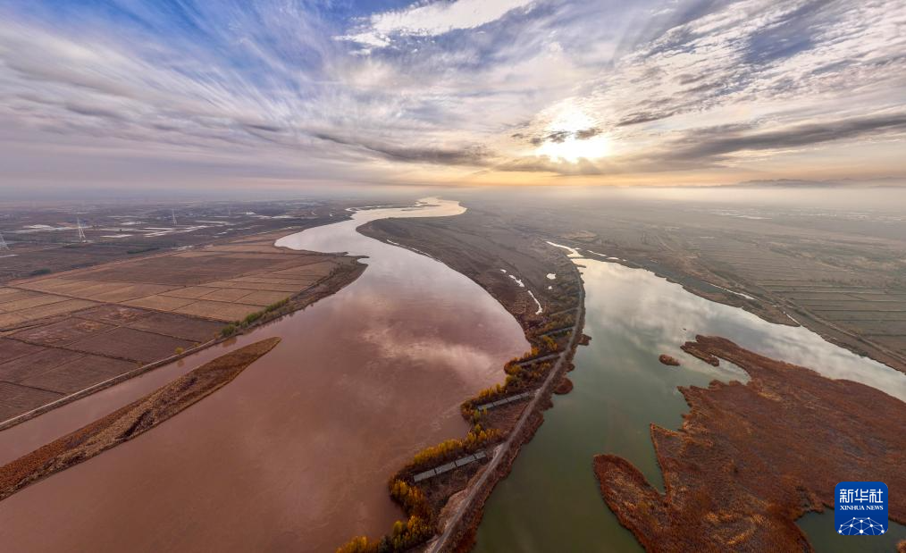 这是11月11日拍摄的宁夏平罗天河湾国家湿地公园(右)和黄河(无人机照片)。