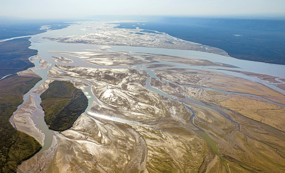 11月11日,黄河万荣段水位出现季节性回落。滩涂之上,水流冲刷出交错纵横的河汊,宛如枝干舒展、脉络清晰的“沙画森林”,蔚为壮观。